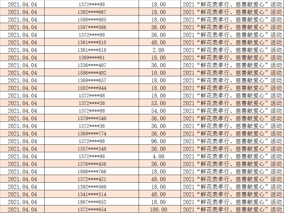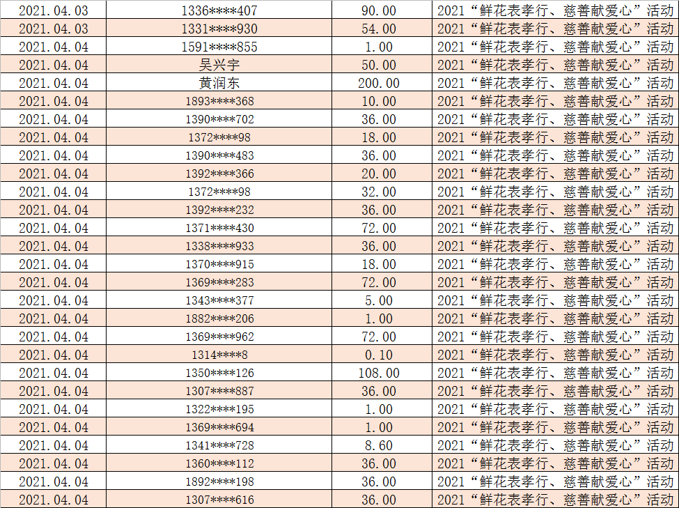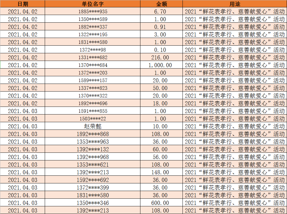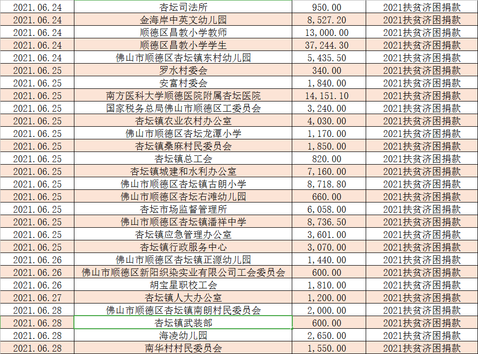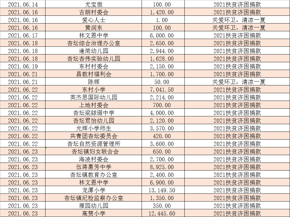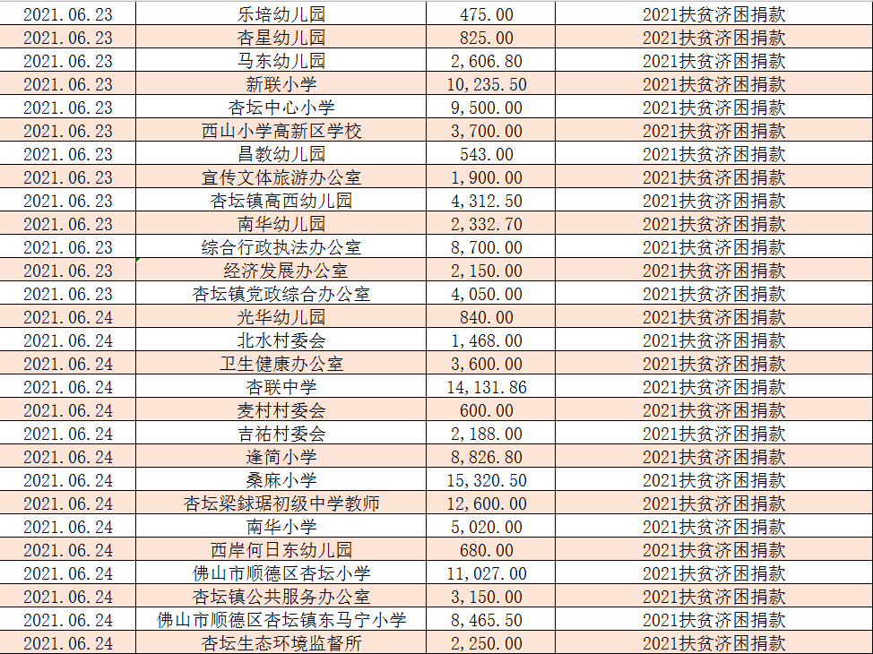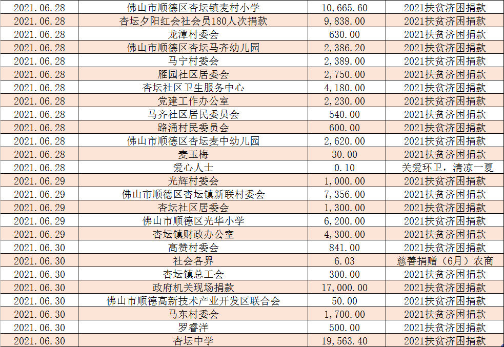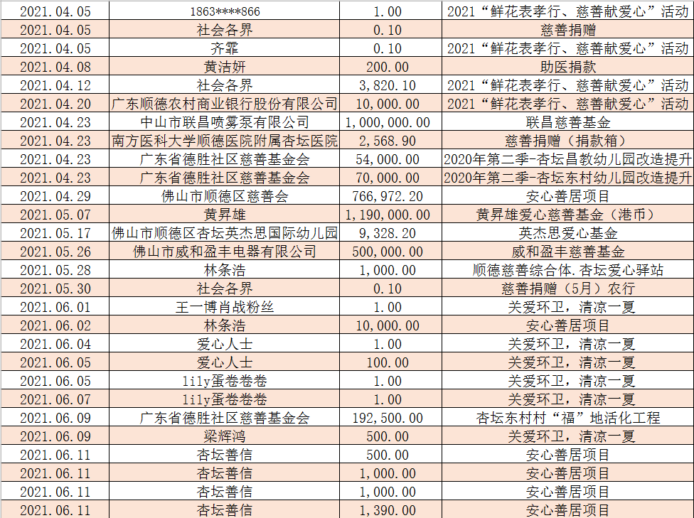 上图为杏坛慈善会2021年4~6月接收资金明细