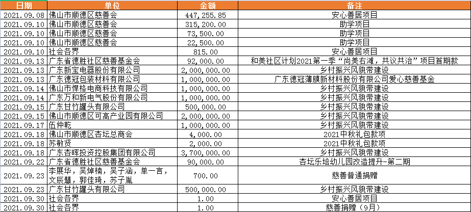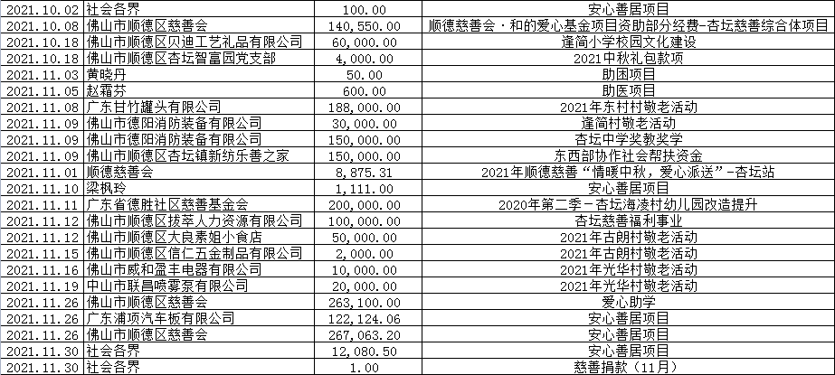 上图为杏坛慈善会2021年9~11月鸣谢名单