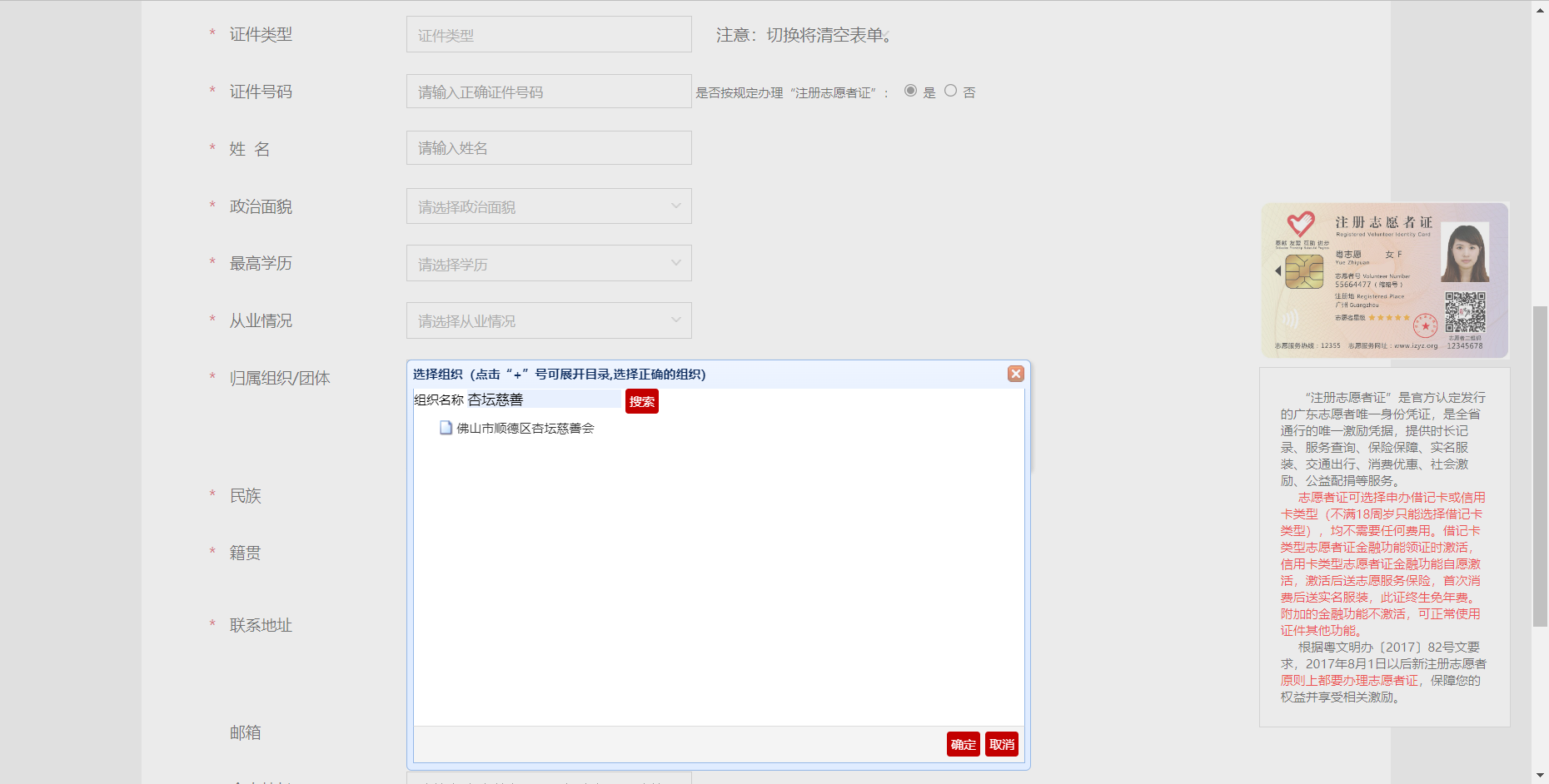 四、填写个人资料时,在“归属组织/团体”栏目的组织名称搜索框内填写“杏坛慈善会”,搜索后选择“佛山市顺德区杏坛慈善会”。